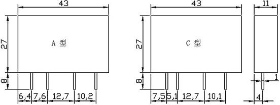 8) 外形尺寸: 长×宽×高 43×11×27mm (不含引脚长度)